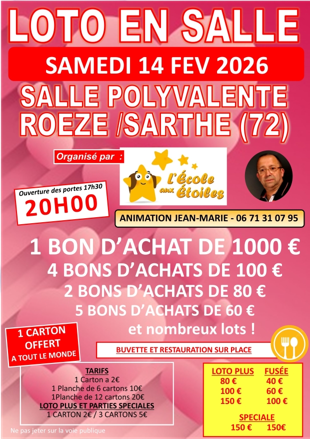 L’école aux étoiles organise un loto en salle le samedi 14 février à 20h00 dans la salle polyvalente de Roëzé-sur-Sarthe. Ouverture des portes à 17h30.
