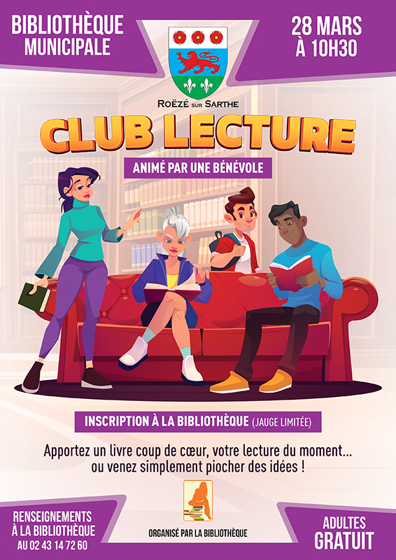 La bibliothèque de Roëzé-sur-Sarthe propose un club lecture pour adultes le 28 mars 2026.