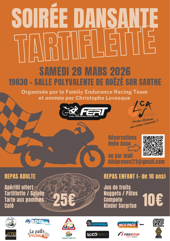 Soirée dansante tartiflette samedi 28 mars à la salle polyvalente de Roëzé-sur-Sarthe avec le Family endurance racing team.